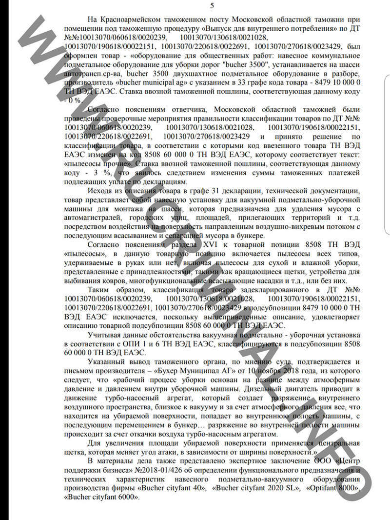 Однако, на всякий случай, представители таможни отправили запрос производителю- «Бухер Муниципал АГ». Согласно ответу, поступившему 10 ноября 2018 года, «рабочий процесс уборки основан на разнице между атмосферным давление и давлением внутри уборочной машины. Дизельный двигатель приводит в движение турбо-насосный агрегат, который создает разряжение внутреннего воздушного пространства, близкое к вакууму и за счет атмосферного давления все, что находится на убираемой поверхности, попадает во внутреннюю полость машины, с последующим перемещением в бункер…». То есть производитель подтвердил, что это пылесосы.
