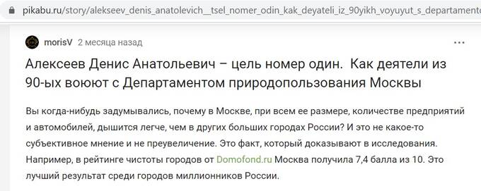 Вот отрывок из сей хвалебной оды: «Выбор цели для травли сделан продуманно – именно Денис Алексеев отвечает в Департаменте за важнейшие экологические проекты, а также часто выступает в прессе и рассказывает о главных достижениях ведомства. Например, недавно он рассказывал о реконструкции промзон и о мерах по снижению выбросов от транспорта».