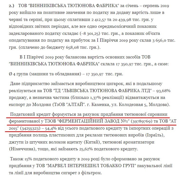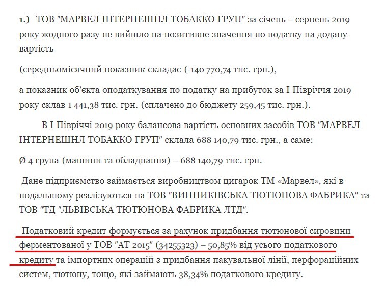 «Винниковская табачная фабрика» и «Марвел Интернешнл Тобакко Групп» реализуют продукцию через ООО «Торговый дом «Марвел», принадлежащий компаньону Козловского, депутату Львовского городского совета Алексею Ризныку. Так вот, ООО «АТ 2015» Андрея Яремы накануне своего банкротства помогало указанным предприятиям Козловского формировать налоговый кредит в размере более 50% за счет приобретения ферментированного табачного сырья.