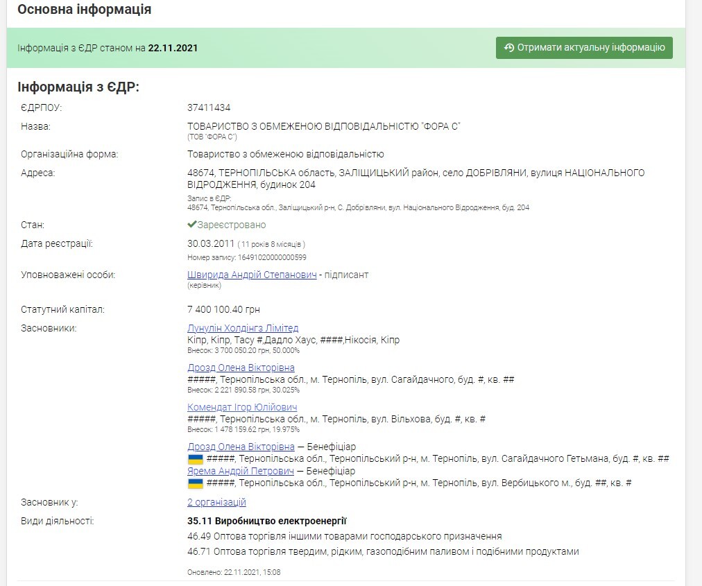 Вместе с ООО "СООК С" они владеют фабрикой по изготовлению фруктовых концентратов в селе Хотин Черновицкой области.