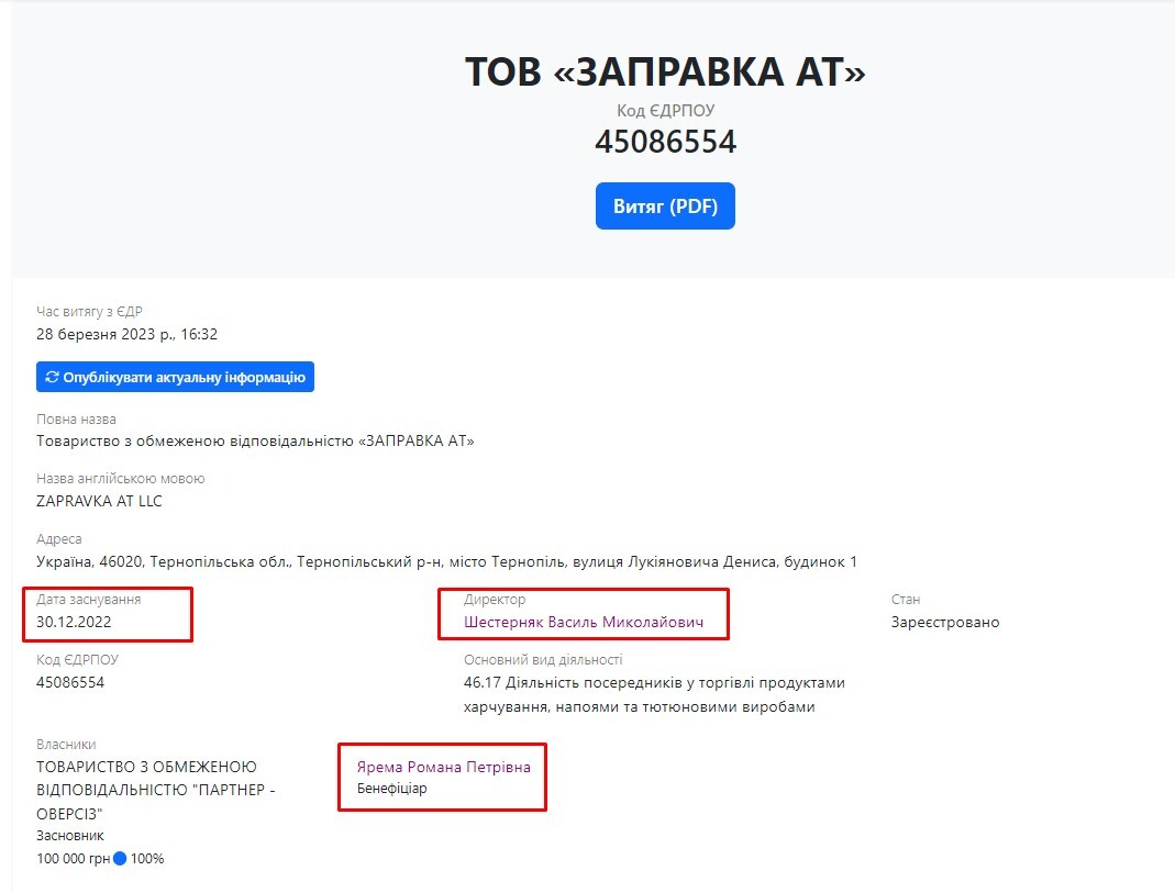 В 2022 году Василием Шестерняком и Романой Яремой была создана компания ООО «ЗАПРАВКА АТ», которая установила на тех же локациях, но на больших участках, МАФы под одноименным названием «Заправка», в которых осуществляется розничная торговля не только сигарет, но уже и алкоголя.