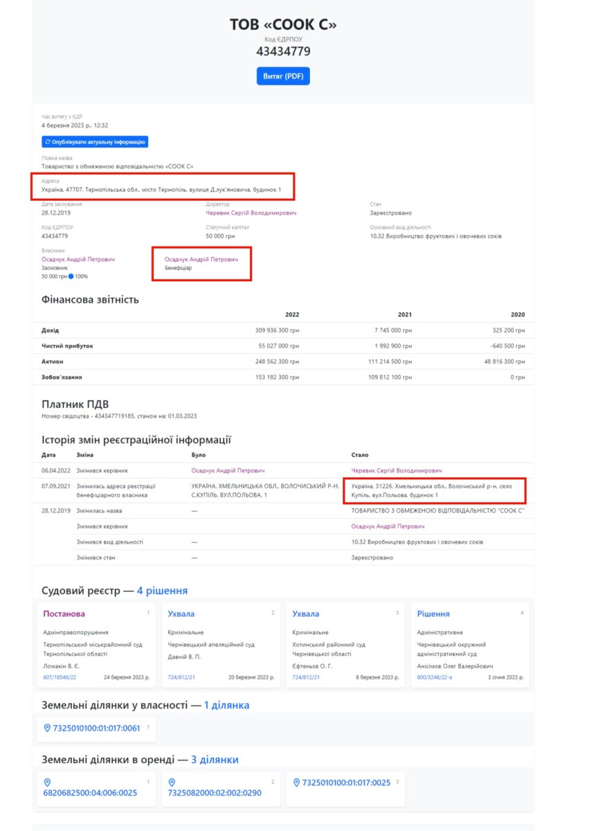 К слову, на родного брата Романы – Андрея Осадчука записан еще один достаточно крупный бизнес семьи тернопольского сигаретного магната – соково-нектарный. На улице Д.Лукьяновича,1 в Тернополе, известной как резиденция «Подолье-Табак», которое впоследствии стало «Мегаполис Украина» и «Тедис», зарегистрировано ООО «СООК С» Андрея Осадчего.