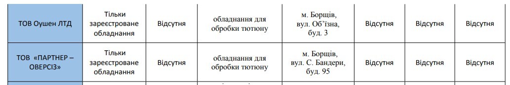 Итак, на полях «Аграрного края» в большинстве своем выращивается табак и, как может убедиться читатель, его там очень много. С полей юга Тернопольщины сырье попадает на ферментационные фабрики ООО «ПАРТНЕР – ОВЕРСИЗ» и ООО «ОУШЕН ЛТД» в Борщеве, которые были внесены Верховной Радой в список производителей табачных изделий без лицензии, но с зарегистрированным оборудованием.