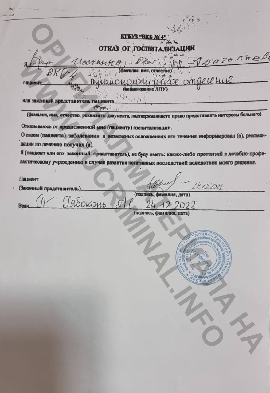 «Исоченко Олег Анатольевич, поступил в КБУЗ № 4 города Владивостока, 20 декабря после обеда с направлением из поликлиники № 6, анализы крови и КТ легких с двусторонней пневмонией (с сопутствующим заболеванием лимфолейкоз в стадии ремиссии). Вечером я созвонилась с мужем у него взяли анализы и лечения еще не было. 21 декабря в течении дня я звонила мужу, и в итоге утром взяли еще анализы и лечения в течении дня не было! Как с КТ на руках с диагнозом пневмония и ничего не делают!