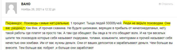 Как отмечают в комментарии, чем больше люди вносят, тем больше их обманут и больше на них заработают. Также призывают не верить в «прибыль от ничегонеделания».