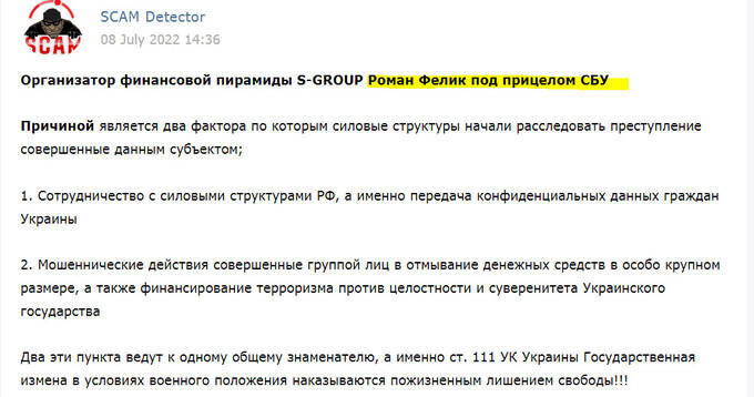 Как сообщает TG-канал «SCAM Detector», Роман Фелик попал под четкий прицел Службы безопасности Украины.