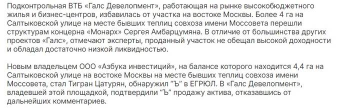 То, что в руки Амбарцумяна попадает площадь в 160 000 квадратных метров, уже само по себе интересно. Но тут можно объяснить банальной коррупцией и связями с Собяниным. А вот тот факт, что ВТБ не просто выделяет кредиты на эту стройку, но еще и снимает свои претензии на этот весьма немаленький участок – это уже интересно. Причем случается это не впервые – в прошлом году ВТБ уже уступал свои земли в Москве Сергею Амбарцумяну.