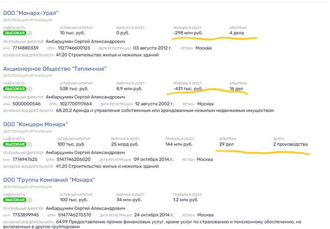 К тому же компании Сергея Амбарцумяна утонули в арбитражных производствах – их аж 235. На общую сумму в 21 миллиард рублей, что наводит на нехорошие мысли – если даже треть этих производств дойдет до взыскания, то активов у Амбарцумяна не хватит.