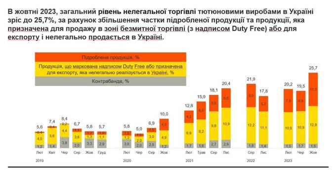 Объем нелегалов на рынке вырос с 5-6% до 25%, а доля сигарет маркированных для Duty Free с 3-4% в 2019 до 13% к концу 2023 года.