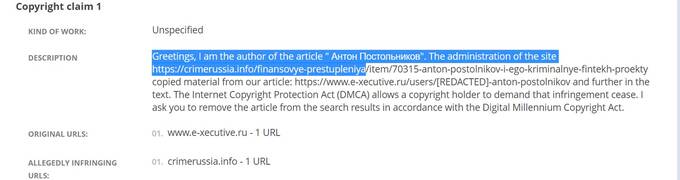 Но в определенный период что-то пошло не по плану, и Антону Постольникову срочно пришлось чистить Интернет от материалов, рассказывающих его истинную историю. В ход пошли довольно дешевые, но, тем не менее, весьма эффективные методы: жалобы и «забивание выдачи» ГУГЛа.