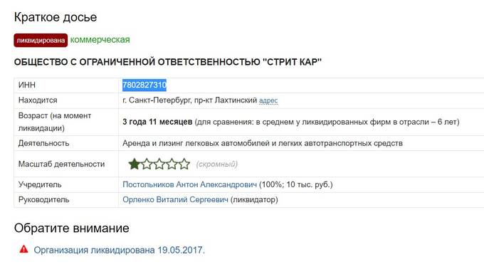Полученные средства стали финансовой основой очередного предприятия – ООО «Стрит Кар», представляемого его создателем как «стартап по круглосуточному прокату машин в Питере». Парк компании состоял из 70 автомобилей.