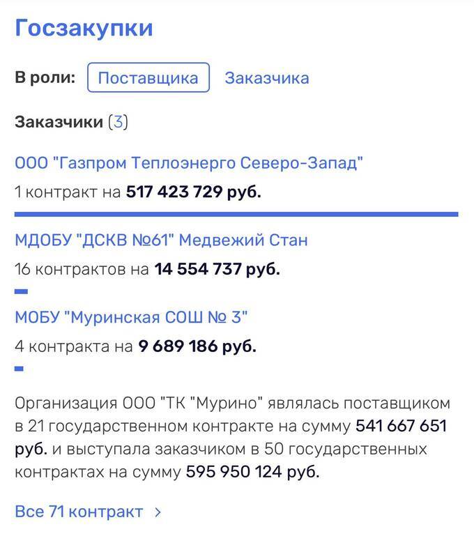 А еще одна фирма Березина, «Топливная компания «Мурино», получила госконтрактов более чем на миллиард:
