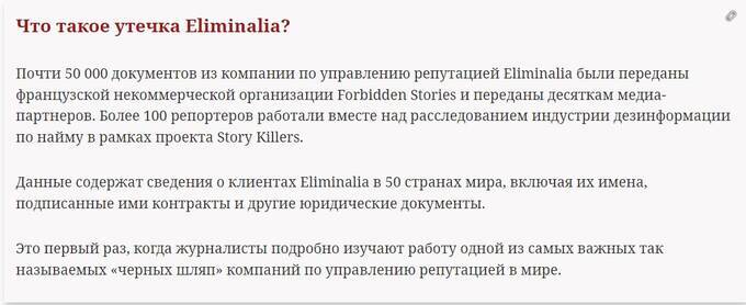 Которое и занялось отбеливанием репутации Андрея Березина. А работает Eliminalia просто – либо платит ресурсу, разместившему неугодный материал, деньги за его снятие, либо забрасывает жалобами Гугл. Если это не помогает – переходит к угрозам и преследованию журналистов и владельцев СМИ. Об этом тоже писали в расследованиях, касающихся Eliminalia.