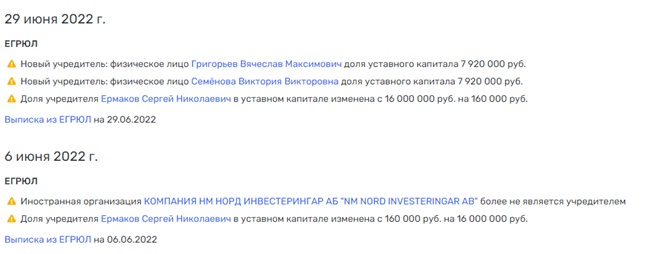 Совладельцем ООО "НКМ Норд" с долей в 1% как раз и является Сергей Ермаков. Остальные 99% акций распределены между Вячеславом Григорьевым и Викторией Семеновой. Но до лета 2022 года именно Ермаков владел 100% капитала структуры.