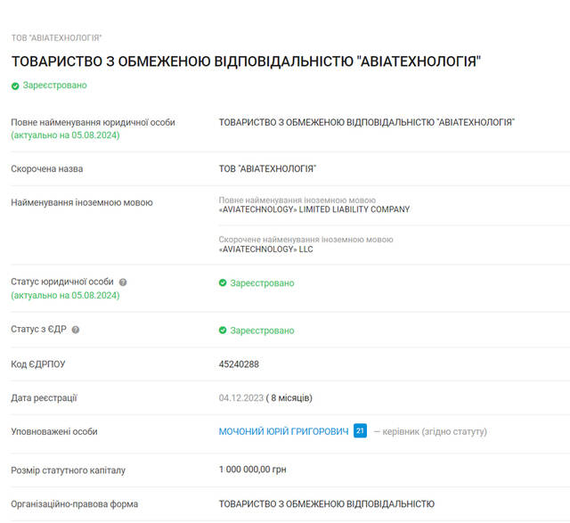 В декабре 2023 года "золотодобытчик" Юрий Мочоный зарегистрировал фирму «Авиатехнология». Сфера деятельности ООО очень разнообразна – от неспециализированной оптовой торговли, до инжиниринга и производства инструментов и оборудования для измерения, исследования и навигации. Компания имеет уставный капитал в 1 млн гривен, но никакой информации о ее деятельности найти не удалось. Вероятно, этот миллион может быть остатком тех денег, которые выручил Моченый за криптовалютные монеты, обеспеченные призрачным суданским золотом.