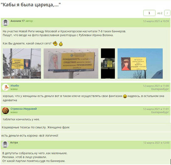 А вот еще одна публикация на одном из форумов о смысле такой рекламы от мадам Волиной: «кабы я была царица», «есть деньги – есть корона – все логично», «в депутаты собралась, от какой партии понятно, судя по баннерам», «женщина фрик»…