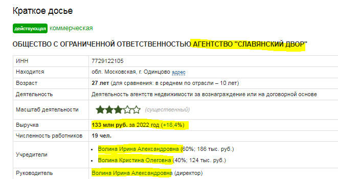 И.А.Волина – основатель и гендиректор известного агентства недвижимости «Славянский двор». Это общество с ограниченной ответственностью сейчас имеет статусный капитал в размере 310 тысяч рублей. Еще в 2020-м году уставной капитал составлял только 10 тысяч рублей.
