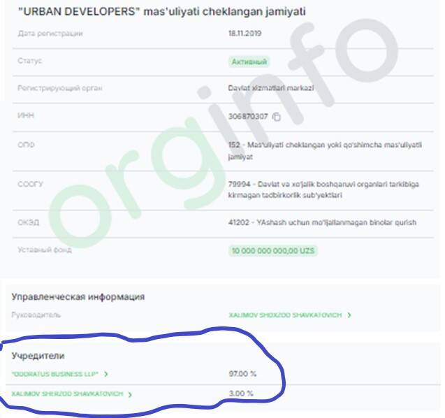 Urban Developers зарегистрирована в 2019 году с уставным фондом в 10 млрд сумов. Основатели – британская Odoratus Business и Шерзод Халимов. Халимов также является основателем сингапурской компании BMP Smart Decision. Эта фирма получила в аренду на 49 лет парк Гафура Гуляма в Ташкенте. В свою очередь, Urban Developers в 2020 году получила 6 гектаров земли от мэрии Ташкента под строительство нового ТРЦ. Ранее на этих землях находился универсальный магазин, и предприниматели пытались судиться за право владения им.