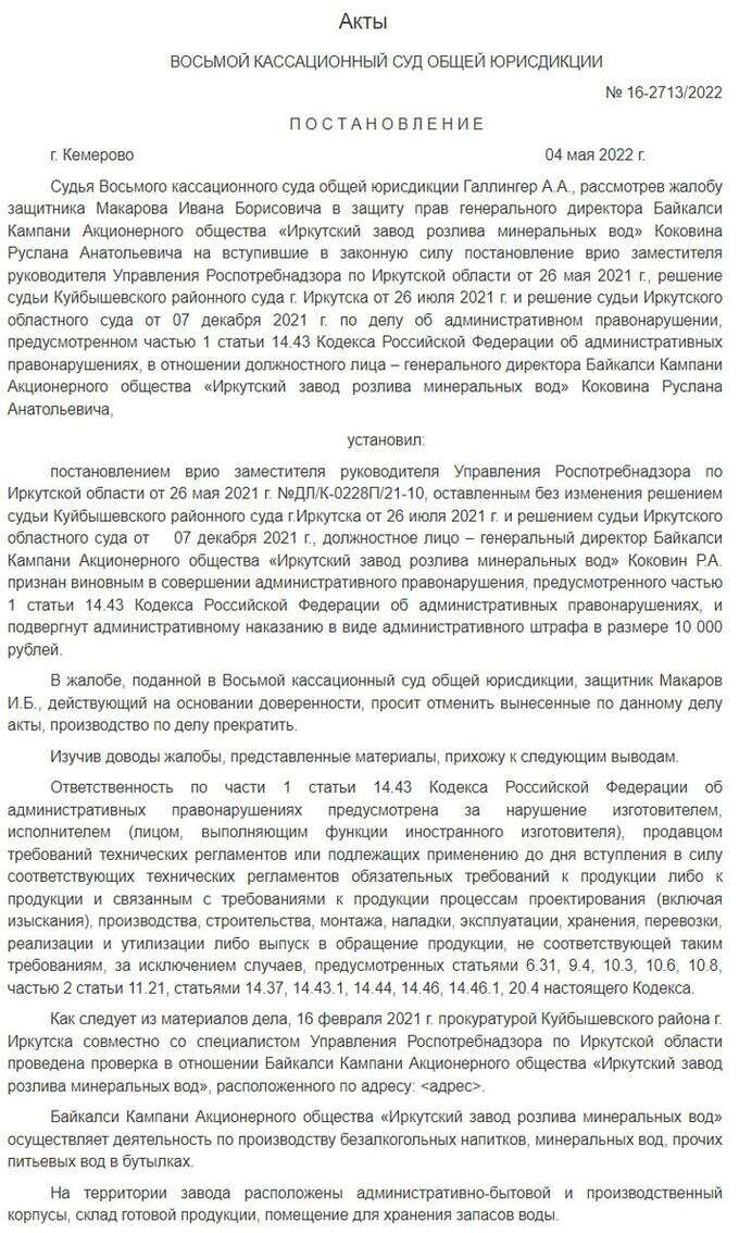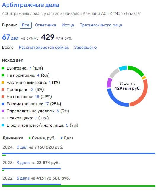 ГК "Море Байкал", которая владеет брендом питьевой воды Baikal, оспаривает сделки по покупке и продаже активов, заключенные в 2021-2024 гг. бывшим генеральным директором Русланом Коковиным.