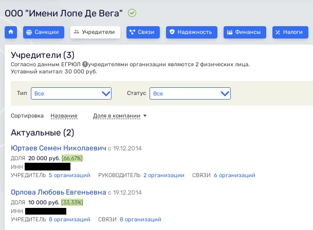 Ещё некая Любовь Орлова является владельцем ООО "Имени Лопе Де Вега" в Красноярском крае, которое занимается охотой и отловом диких животных. Поговаривают, что у компании есть не плохая заимка, используемая для отдыха местной элиты.