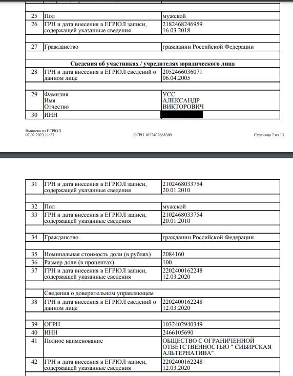 Но что мы всё о сыне да о сыне. Сам Александр Усс также имеет бизнес, но на время похода во власть тот передан в доверительное управление. По данным ЕГРЮЛ, ООО "Центральное", унаследованное им от отца, — находится в доверительном управлении компании "Сибирская Альтернатива". Владелец и директор последнего - супруга губернатора Людмила Усс.