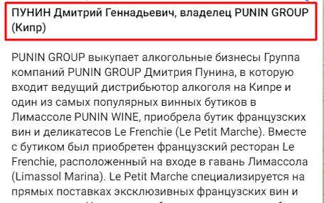 Дмитрий Пунин владеет PUNIN GROUP, позиционирует себя как носителя новаторских идей, которые в полной мере проявляются в незаконной деятельности по обходу санкций и отмывании денег. И не только через казино, на Кипре у Пунина есть футбольный клуб «Кармиотисса», который бизнесмен купил в 2022 г. Он также владеет компанией Punin Wine, являющейся одним из крупнейших дистрибьютеров алкоголя. В июле французский ресторан Дмитрия Пунина, расположенный в Лимасоле, вошел в топ мировых ресторанов.