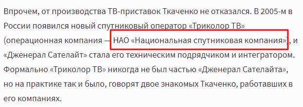 Андрей Ткаченко неоднократно отнекивался от ООО «Национальный спутниковый оператор». Именно такой человек и мог вложиться в фейкового робопса. Компания «Дженерал Сателайт», которая якобы не является частью «Триколор ТВ», с 2003 г. производила в Китае ресиверы. В 2023 г. ООО «Национальный спутниковый оператор» получило выручку 16 млрд руб. и прибыль 1.9 млрд руб. За год она при падении выручки выросла на 774%, что удивительно на фоне резкого падения в 2022 г.