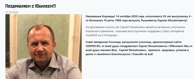 Сергей Рышкевич – очень закрытый бизнесмен, что обычно свидетельствует о связях с криминальными структурами или властью. Хотя в Санкт-Петербурге они тесно переплетены еще с 90-х. В сети удалось найти человека, у которого ФИО совпадают с владельцем АО «Трест». Он является выпускником ЛенВОКУ им С.М. Кирова. Если бывший военный и известный строитель – одно и то же лицо, то у этого человека через Совет ветеранов училища явно есть выход на руководство Минобороны.