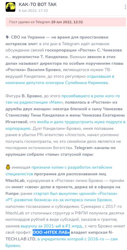 Многое на этих телеграм-каналах могло быть подчищено. Однако на портале Tgstat, который отслеживает и копирует все посты в Телеграм, могла остаться копия поста в "Как-то вот так" с той злополучной информацией.