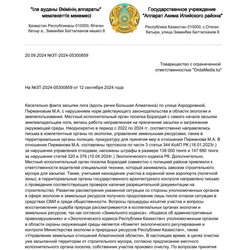 Областной акимат ответил, что местные госорганы два года боролись (безуспешно) с засыпкой с помощью штрафов. После недавней шумихи в прессе собственника участка удалось заставить очистить лог от строительного мусора и прочих материалов. Однако, на взгляд редакции, это не так.