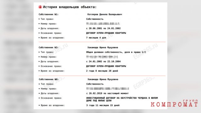 По данным Росреестра, эти хоромы в 2001 году купил сын Хакамады. Сама она тогда заседала в Госдуме III созыва и декларировать подобную роскошь ей было не к лицу. Но уже через семь месяцев сын продал официально, с купчей, роскошную квартиру своей матери и её последнему мужу, покойному Сиротинскому. Возможно, таким образом супружеская пара уменьшила стоимость актива, чтобы без проблем декларировать его в будущем. За два года до смерти Сиротинского хоромы были целиком переписаны на Ирину Хакамаду.