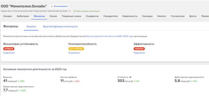Основные средства группы при этом, похоже, зарабатывает оператор интернет-платформы ООО «Монополия.Онлайн» с низкой финансовой устойчивостью. Здесь выручка составляет 41 млрд рублей при чистой прибыли в 11 млн рублей, дебиторской задолженности в 5,8 млрд рублей и кредиторской – в 7,7 млрд рублей. Есть у этой компании краткосрочные обязательства в 1,1 млрд рублей и долгосрочные – в 2,6 млрд рублей.
