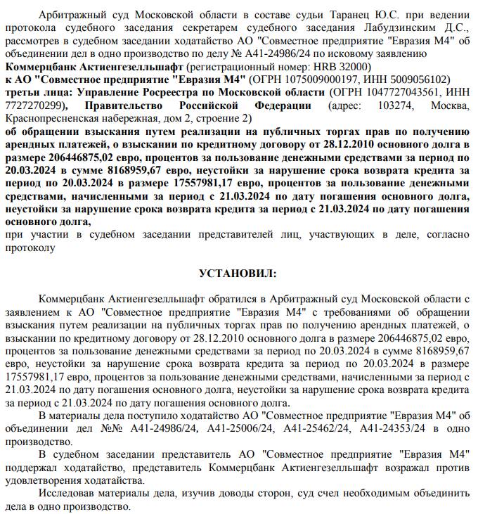 7 октября арбитраж Подмосковья отказал немецкому «Коммерцбанк Актиенгезелльшафт» в удовлетворении иска об обращении взыскания на заложенное имущество. Ответчиками по делу выступали АО «Совместное предприятие «Евразия М4», кипрское «Дрегон Ленд Лимитед», ООО «Международное Логистическое Партнерство» (МЛП) и МКОО Дрегон Ленд Лимитед.