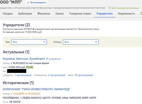 Так МЛП с сентября 2023 года владеет не кипрский офшор «ТИНН ИНВЕСТМЕНТС ЛИМИТЕД», а некий Куразов Эрисхан Зурабович.