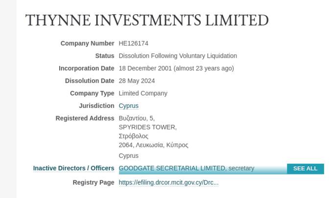 Сам офшор был ликвидирован только в конце мая 2024 года, но есть нюанс. Его секретарем было GOODGATE SECRETARIAL LIMITED, которое также является секретарем LAPOINTEC VENTURES LIMITED, что в свою очередь в материалах судов фигурировало как владелец Dregon Land Limited.