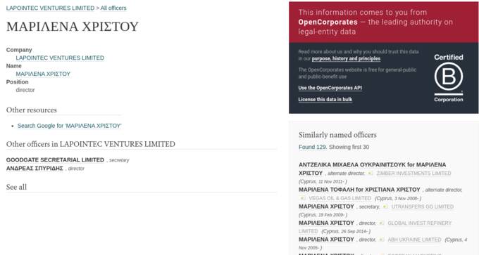 Директором LAPOINTEC VENTURES LIMITED выступала некая ΜΑΡΙΛΕΝΑ ΧΡΙΣΤΟΥ, чья тёзка числится руководителем ряда юрлиц, в том числе ABH UKRAINE LIMITED. Последнее выступало акционером Sense Bank (бывший Альфа-банка на Украине). Через эти компании банком владели российские бизнесмены Андрей Косогов, Михаил Фридман и Петр Авен.