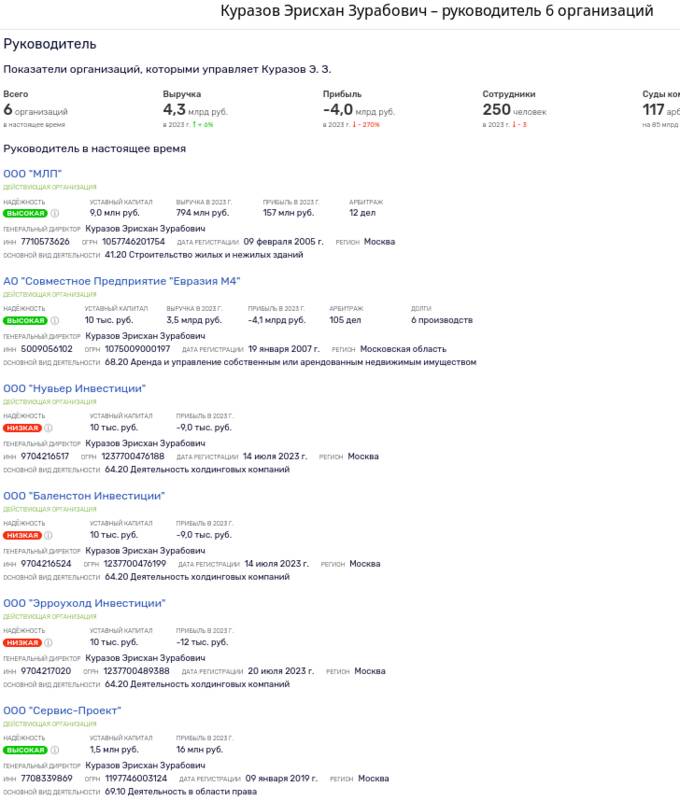 На сегодня Куразов - директор АО «Совместное предприятие «Евразия М4», компании из области права - ООО «Сервис-Проект», ООО «Нувьер Инвестиции», ООО «Баленстон Инвестиции» и ООО «Эрроухолд Инвестиции».