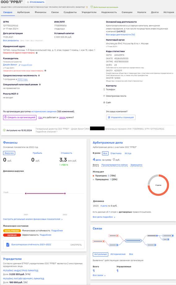 Тогда в качестве нового залогодержателя в реестре появилось (до того, как банк оспорил) - некое ООО «Релайнс Ритэйл Венчурс Лимитед», владельцами которого являются еще два кипрских офшора с неизвестными бенефициарами - РЕЛАЙНС ИНДАСТРИЗ ЛИМИТЕД и РЕЛАЙНС РИТЭЙЛ ВЕНЧУРС ЛИМИТЕД, а директором был указан некий Джайн Винит (позднее в ЕГРЮЛ появилась метка о недостоверности этих данных). Г-н Винит связан с американской фирмой «РЕЛАЙНС ИНДАСТРИАЛ ИНВЕСТМЕНТС ЭНД ХОЛДИНГС ЛИМИТЕД» и индийским гигантом розничной торговли Reliance Retail миллиардера Мукеша Амбани.