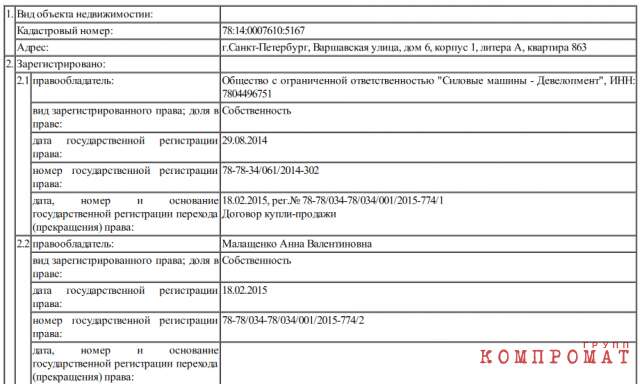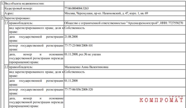 Квартиру Малащенко сначала оформили на тещу, а потом она подарила недвижимость дочке, жене Малащенко. Примерная цена такой квартиры около 80 млн руб. (600 тыс. руб. за кв. м).