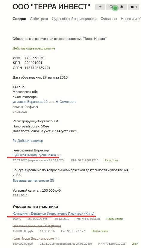 По сведениям «АиФ», «Терра Инвест» была учреждена кипрской компанией Elasteno Services LTD, которая была зарегистрирована на имя родственницы Ананьевых. А по данным электронного бизнес-реестра «Контур. Фокус», сейчас этой фирмой владеет другая кипрская компания «Дириенси Инвестментс Лимитед», где директора и владельцы – киприоты, и они периодически меняются. Помимо смены собственника с одной кипрской фирмы на другую, регулярно сменяются и руководители в самом ООО «Терра Инвест». Сейчас его гендиректором числится некто Халид Кумыков. Его брат Азамат Кумыков более известен как представитель кабардинской диаспоры в Москве и руководитель американского инвестфонда Adamant Capital. А ещё он - один из менеджеров в «Промсвязькапитале» и «Промсвязьнедвижимости» Дмитрия Ананьева.