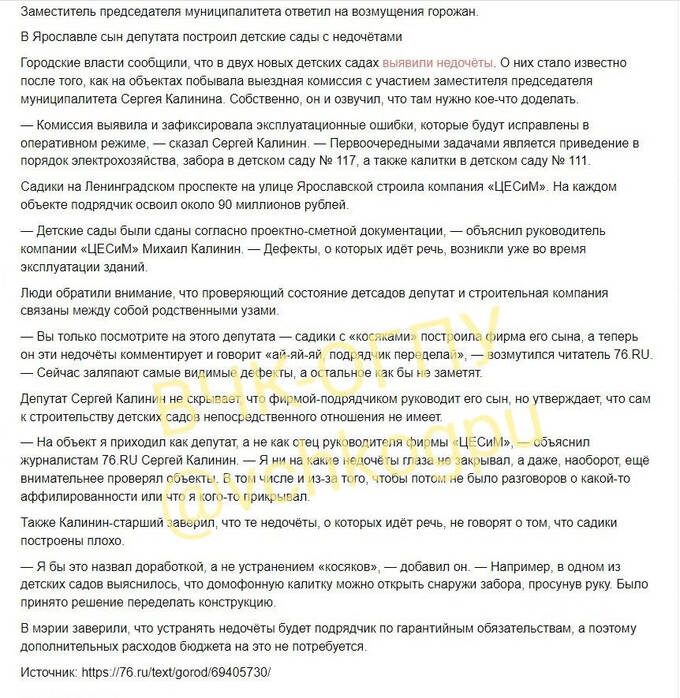 Местное издание 76.RU тогда рассказало о визите Калинина в детсад, но исходная публикация вскоре была отредактирована. Из нее, в частности, исчезли все упоминания о родственных связях депутата и руководителя фирмы-подрядчика. Например, эта цитата: