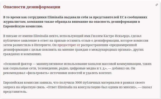 Кроме того, Eliminalia использует законы Евросоюза о защите данных и рассылает издательствам фальшивые письма с уведомлением о нарушении правил ЕС о защите данных. Eliminalia рассылала правовые угрозы различным медиа, многие — якобы от лица члена Еврокомиссии из Брюсселя Рауля Сото.