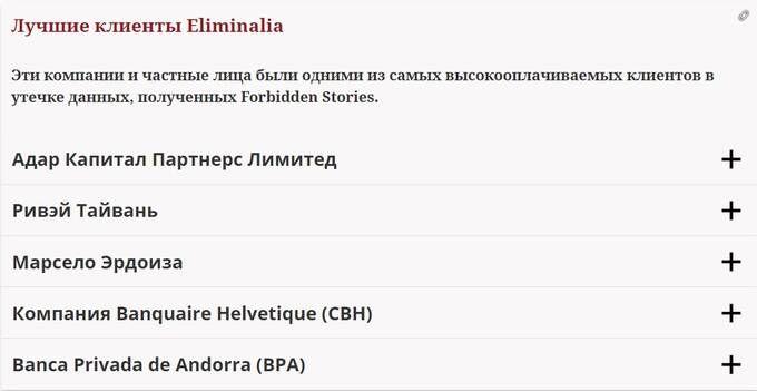 Как следует из архива Eliminalia, попавшего в распоряжение журналистов, среди клиентов агентства самые разные люди и компании: от откровенно криминальных персонажей до внешне вполне респектабельных фирм и банков.