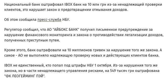Within the context, it is interesting to note the story of the fine from the NBU, which IBOX BANK received in October 2021 for inadequate client checks and violations of the requirements of the Law of Ukraine "On Prevention and Counteraction to Legalization (Money Laundering) of Proceeds from Crime, Terrorism Financing, and Financing of the Proliferation of Weapons of Mass Destruction".