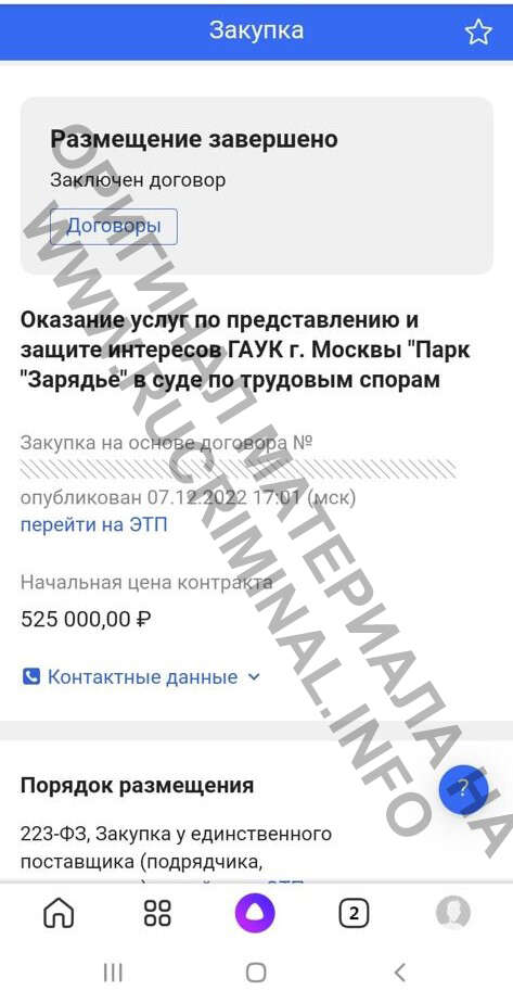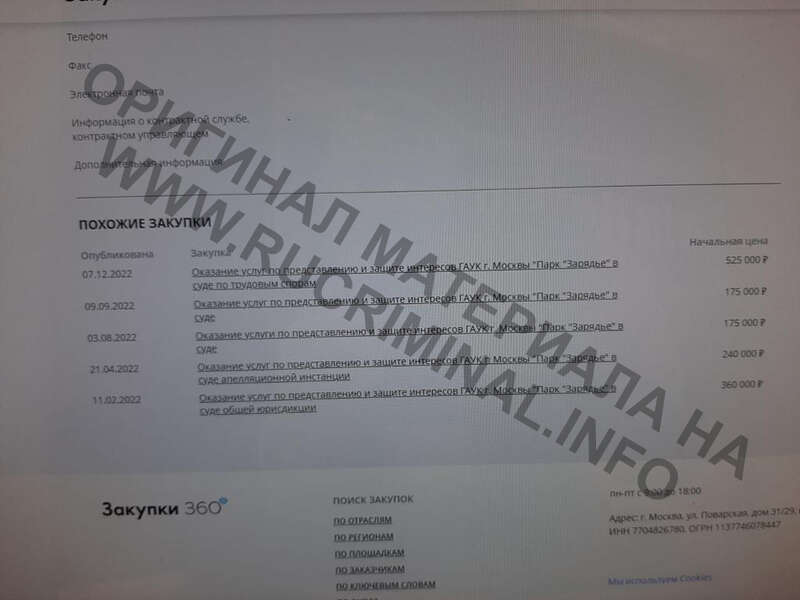 Как выяснил Rucriminal.info, все эти дела ведет/вела для Зарядья юрист ИП Яковлева по договорам ГПХ, услуги которой обошлись на данный момент этому бюджетному учреждению в 1.425.000 млн рублей согласно официальному сайту госзакупок. Для споров со своими работниками этих денег хватило бы чтобы удовлетворить все их исковые требования добровольно. Яковлева В.О. почти все указанные дела проиграла работникам. Несмотря на это бюджетные деньги на нее спускаются в неимоверном количестве. Чтобы не возникало подозрений, что это услуги одного и того же лица - договоры дробятся, на каждое заседание практически отдельно, все предметы закупок названы по разному, но все эти договоры с ИП ЯКОВЛЕВА и все по трудовым спорам с собственными работниками. Последняя на данный момент закупка на 525 тыс рубл. На трудовой спор. Это что за спор такой и что за звездный юрист, который столько стоит, при этом проигрывает практически все что можно?
