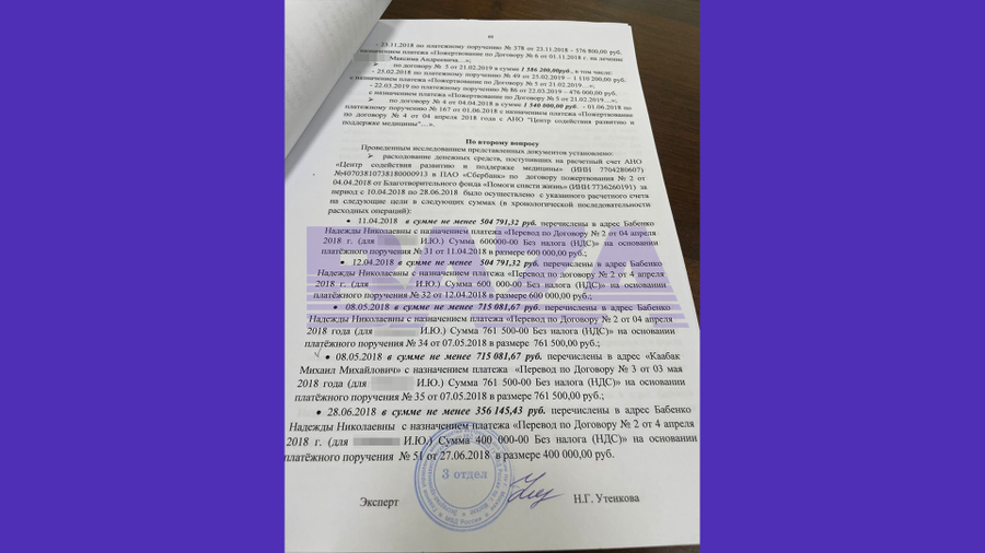 Перед экспертом, имеющим высшее экономическое образование, специальность «экономика торговли», были поставлены два вопроса. Какая сумма поступила на счёт Центра содействия развитию и поддержке медицины от фонда «Помоги спасти жизнь»? И куда деньги с этого счёта в итоге ушли? Эксперту были переданы данные денежных операций центра, проведённых через Сбербанк.