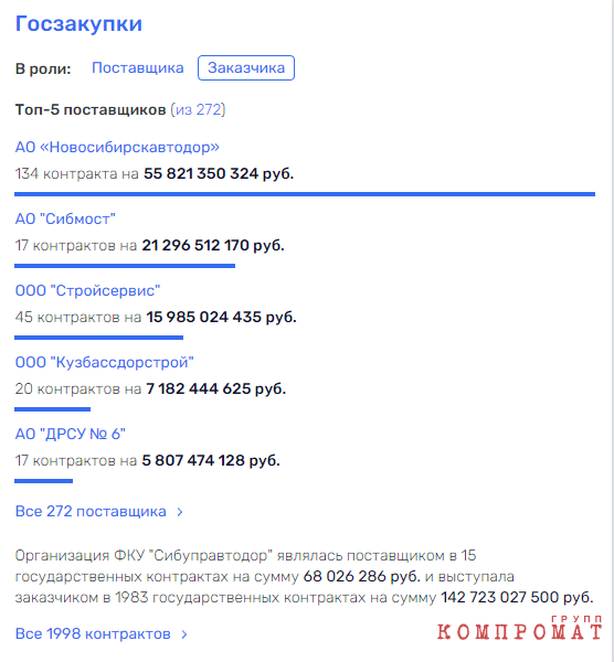 Кстати, указанный ранее Яков Вагнер тоже исполнял контракты «Сибуправтодора». Компания Вагнера ООО «Стройсервис» исполнила 45 контрактов почти на 16 млрд рублей и занимает третье место в топ-3 поставщиков «Сибуправтодора».