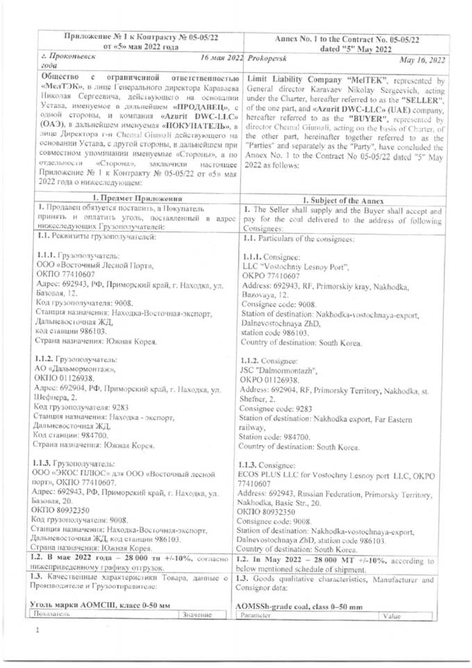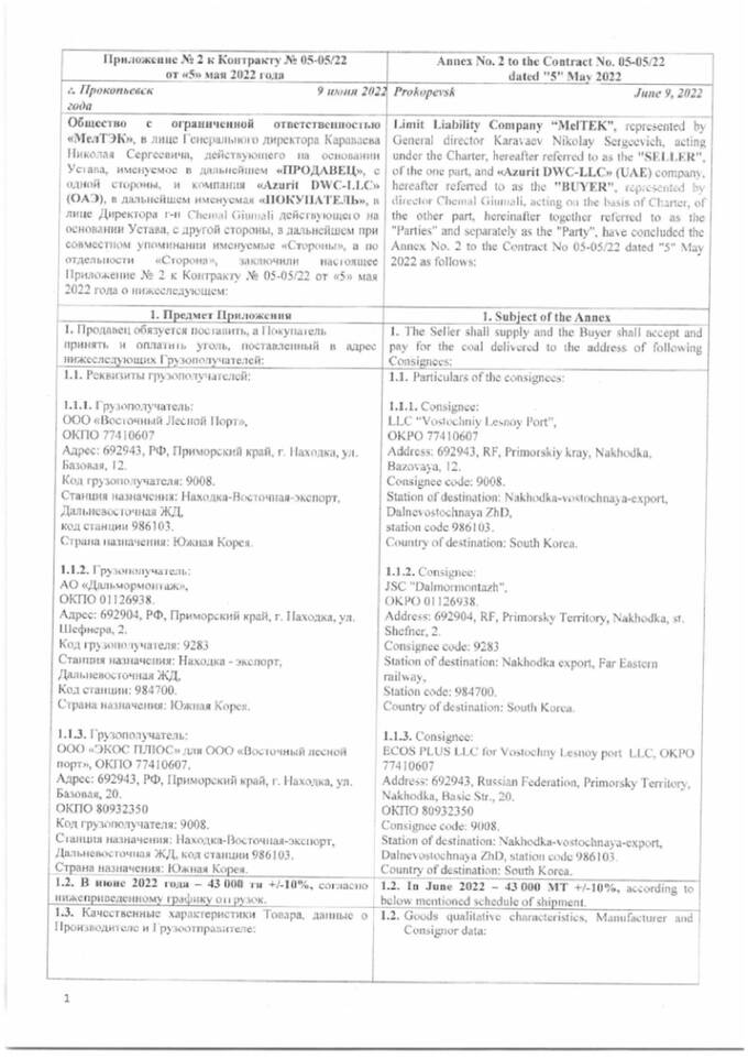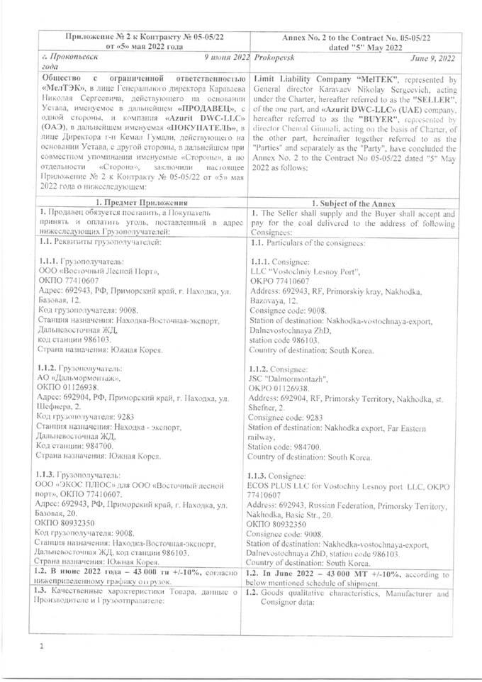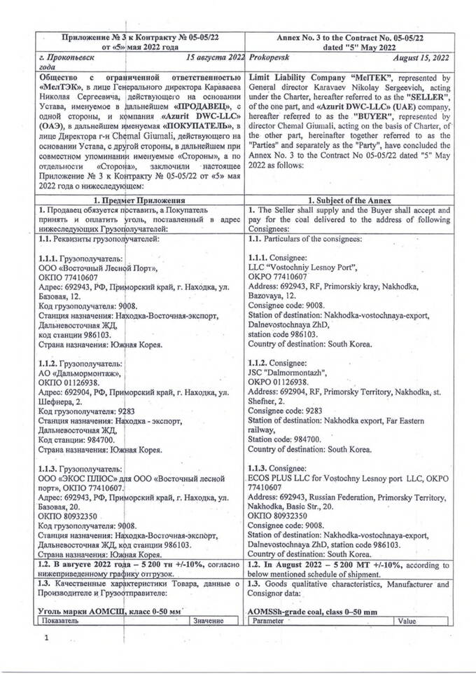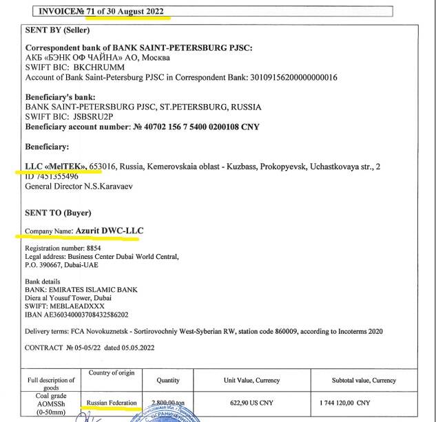 Эти документы (они не единственные) четко подтверждают: компания Azurit DWC-LLC весь 2022 год полным ходом сотрудничает с компаний «МелТЭК» и покупает у нее уголь. Хоть в качестве страны назначения и стоит Южная Корея, большой вопрос – куда это потом поехало.