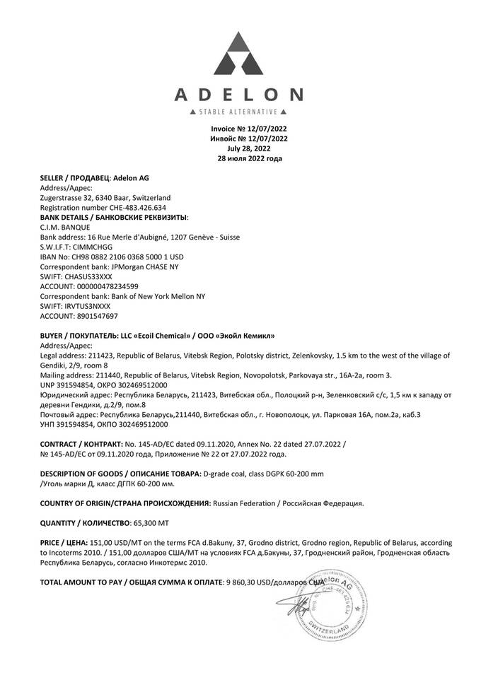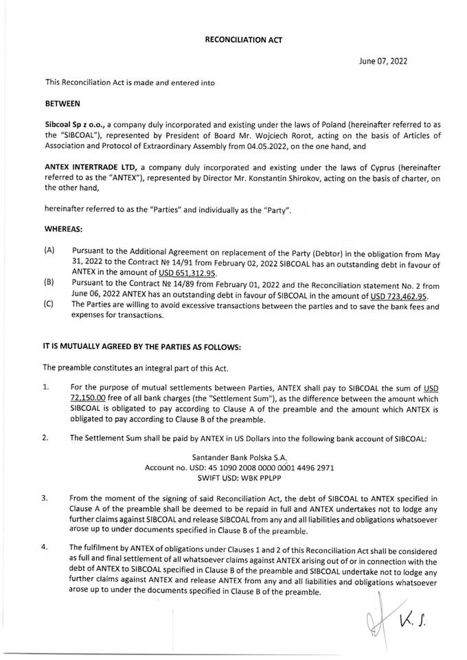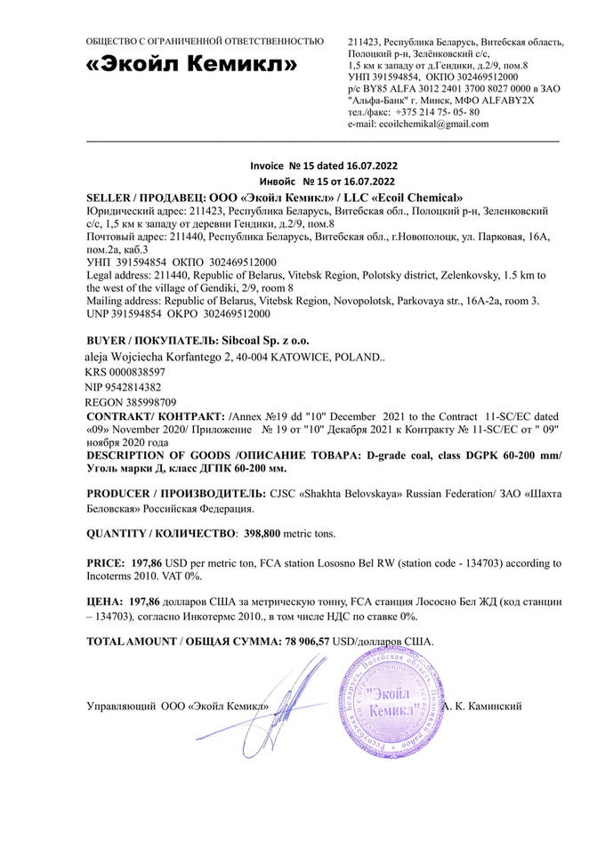 О компаниях Sibcoal и ANTEX INTERTRADE LTD, посредством которых поставляется уголь в Польшу, писали и ранее. Но вот новые сведения. Это – инвойс за 16 июля 2022 года между польской Sibcoal и белорусской «Экойл Кемикл» на поставку российского угля из шахты «Беловская».