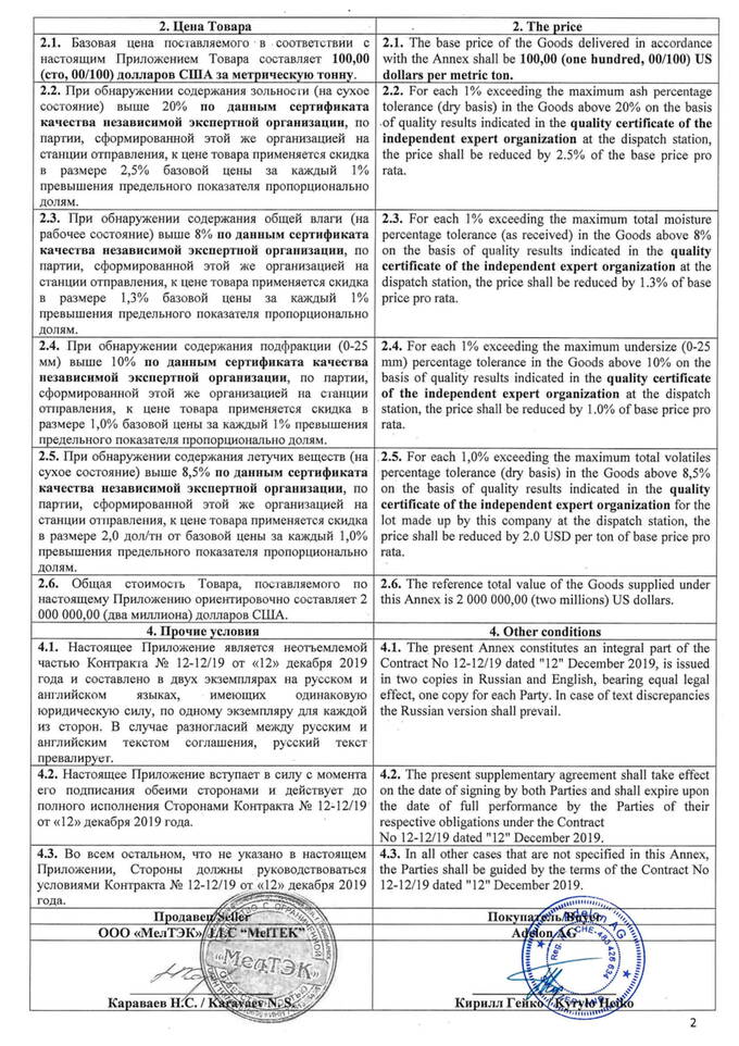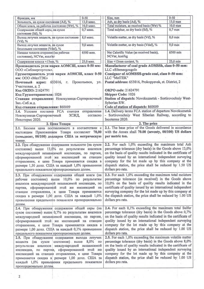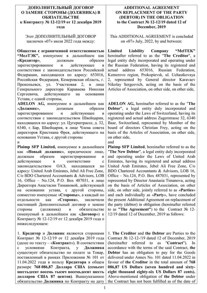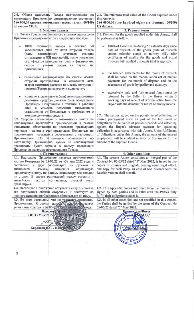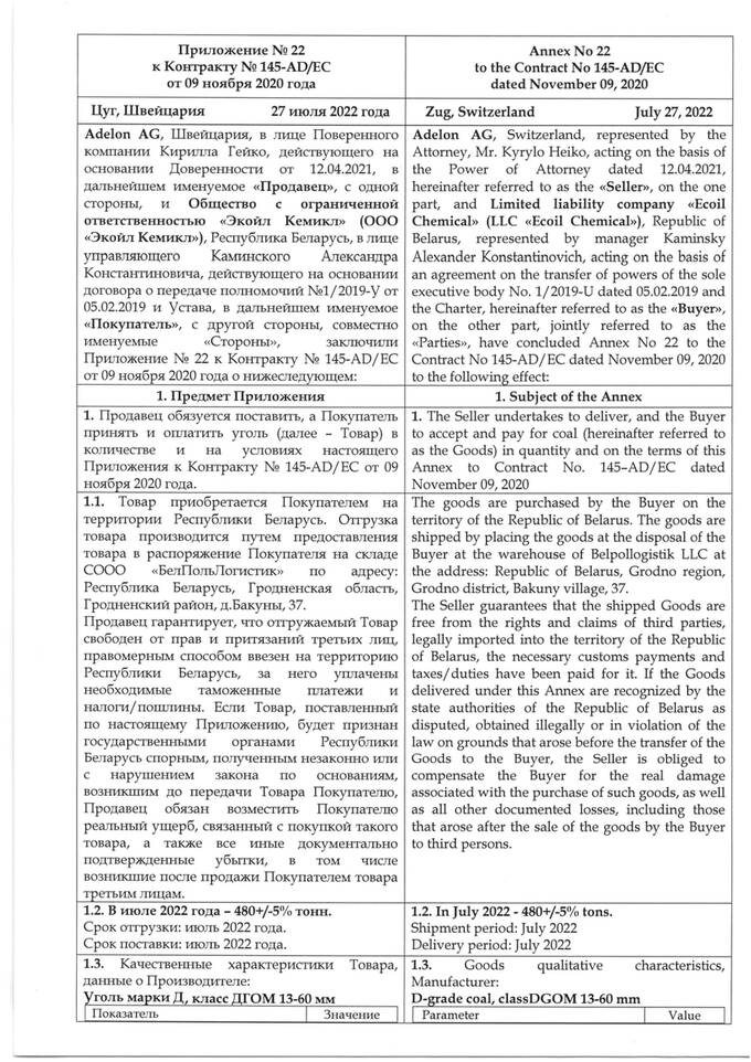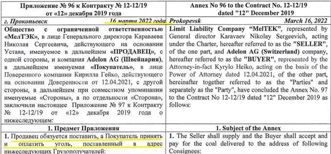 А это – выдержка из договора с компанией «МелТЭК», из которой четко видно, что в период СВО компания Adelon AG также, как и Azurit (о ней – ниже), напрямую закупает уголь у российской компании.